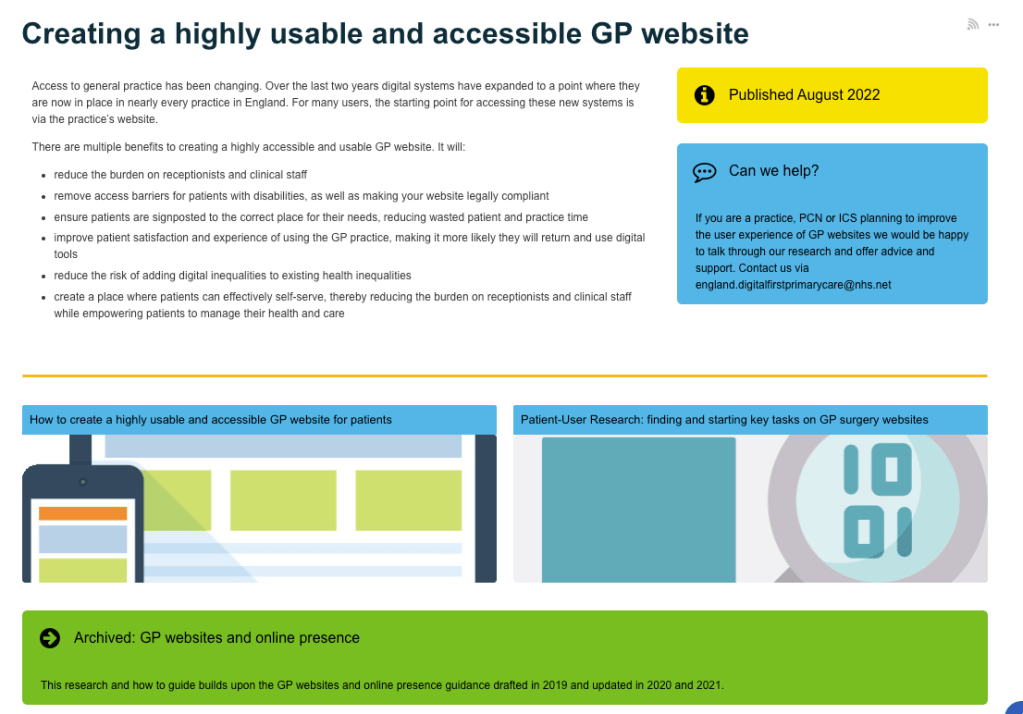 You’ll realise that I have a bit of thing for GP websites.  In my day job, I sit at the intersection between policy makers, NHS commissioners, specialists in inclusive and accessible research and service design, product suppliers and the people in practices who try and make sense of it all, to provide services to us as patients in the NHS.  It’s a nice place to sit.  I don’t need to be a specialist, I don’t need to have the technical know-how, and although I do know a fair bit about General Practice, service improvement and delivery, we all have experiences as patients that we can lean on and learn from. This guidance brings much of that knowledge into one place.