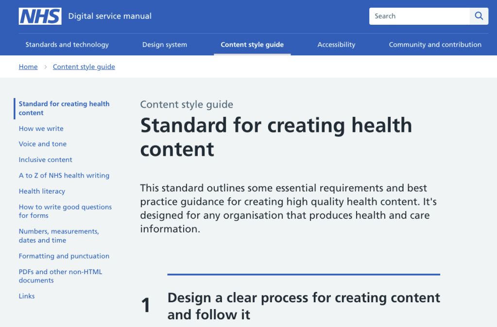 Home page from NHS Digital service manual showing the Standard for creating health content