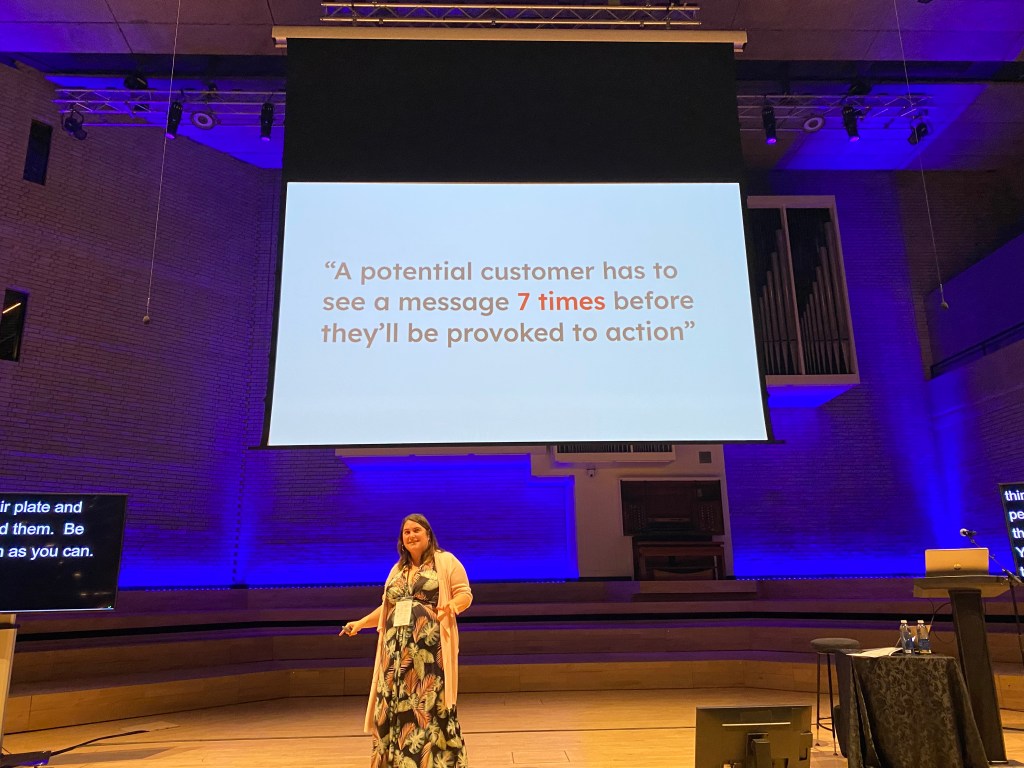The afternoon sessions did not disappoint either.  Audree Fletcher’s ‘Designing in the dark’ gave me many notes to take home, but this one message was a big one. A potential customer has to see a message 7 times before they’ll be provoked to action.